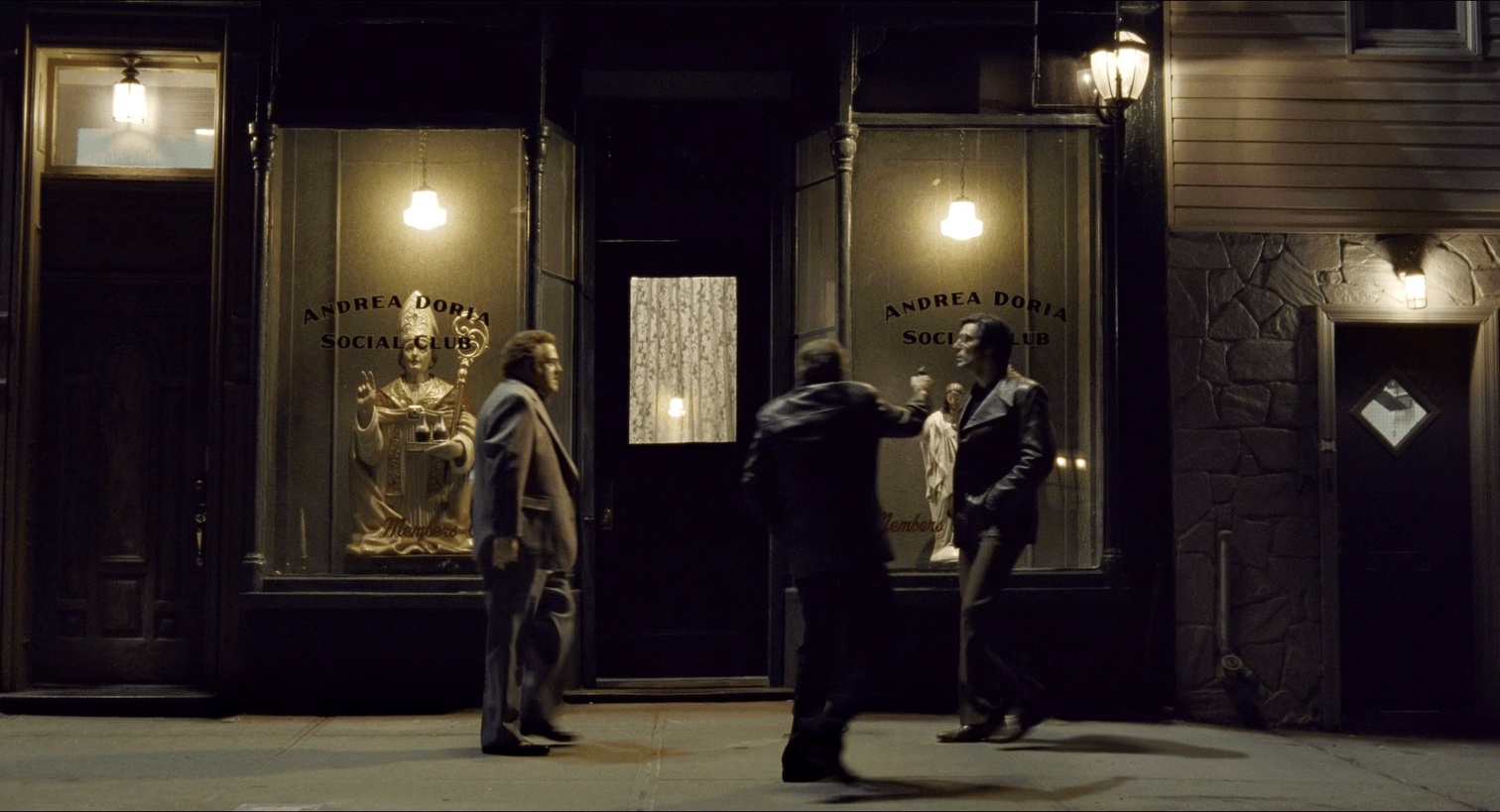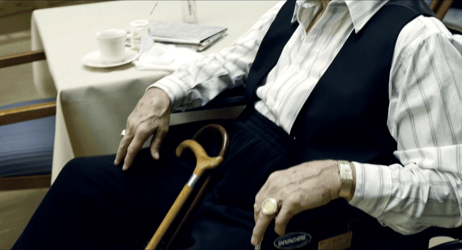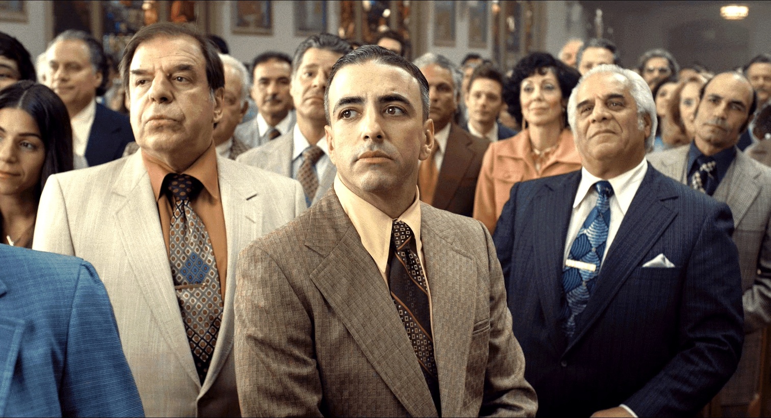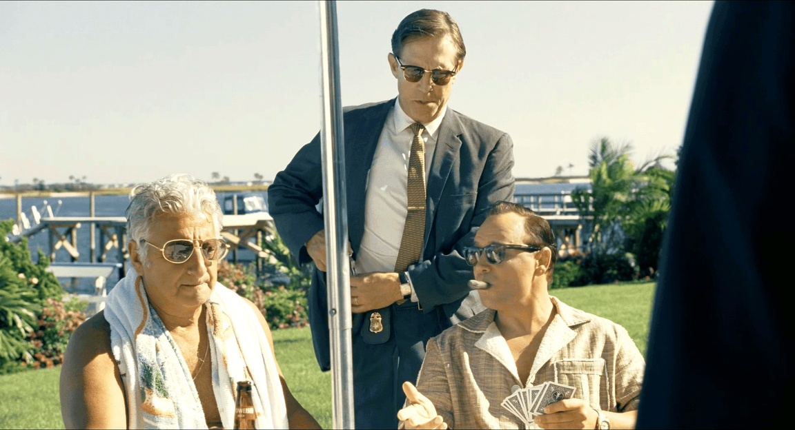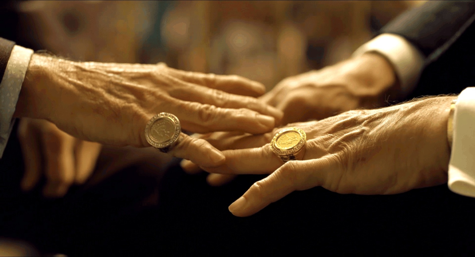说回Frank,他的枷锁是似有实无的生杀予夺大权。整部电影关于Frank事业的两面正是恩师和挚友。电影开篇的长镜头还没推到人物脸上质量先给了手上的两件饰品一个特写。第一遍看到不明所以,觉得只是彰显一下身份地位,二刷的时候五体投地——导演在介绍主人公之前,先给我们看了全篇叙事上的主要矛盾。