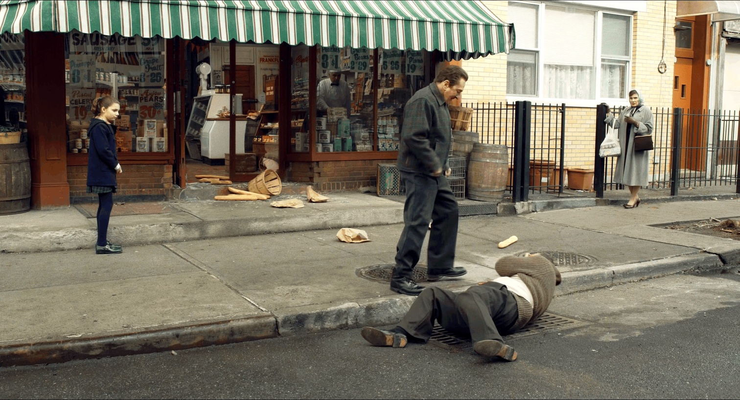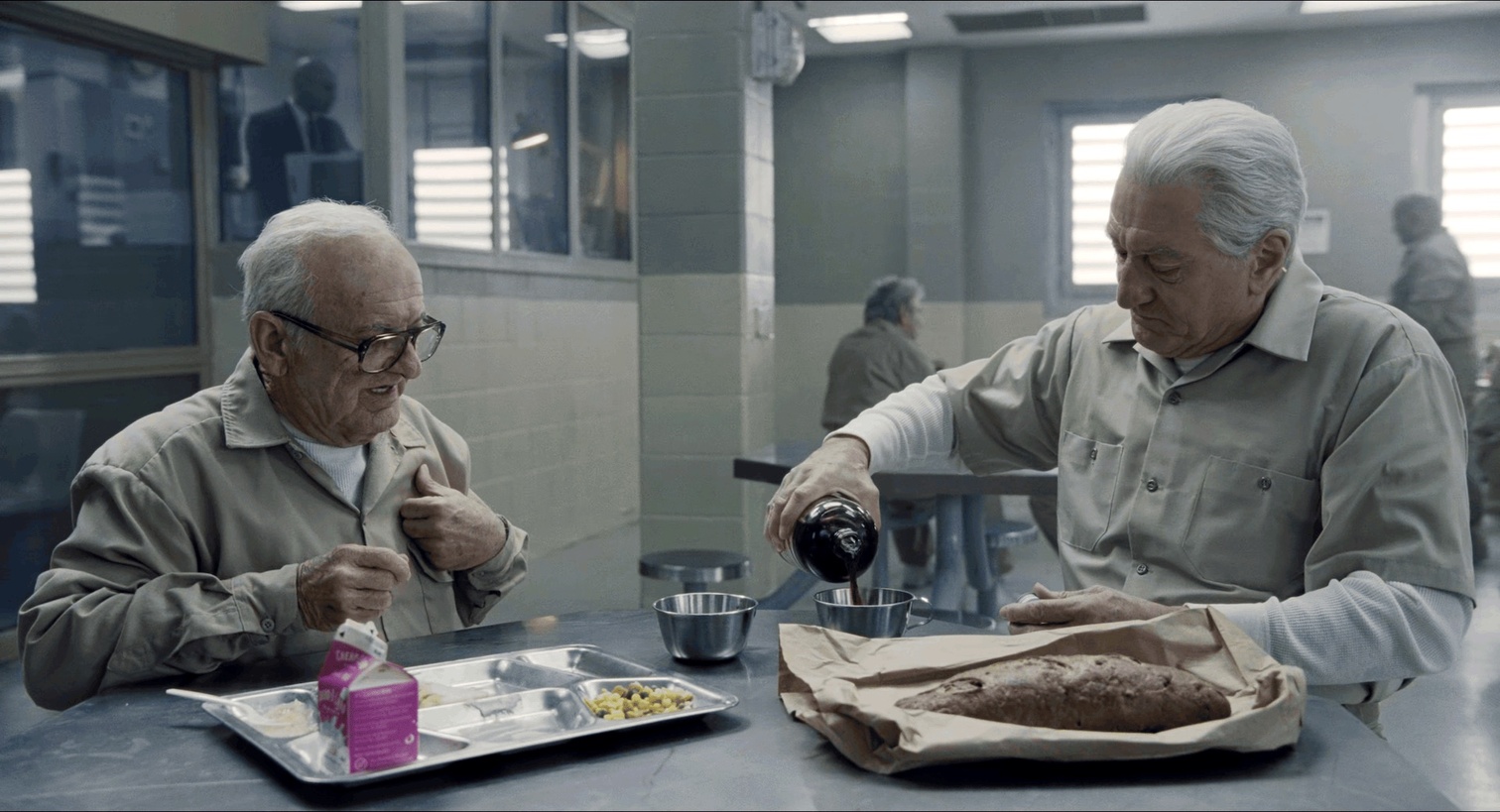 电影还用了大量的对比剪辑做感官冲击。电影开头“I started painting houses”一枪爆头之后镜头立刻切到到婚礼请帖特写。Barber shop杀人的长镜头自然的交代了保镖离开,杀手上楼,最终运镜停在一大束鲜花的特写上,而此时音频轨上是反复的枪声、玻璃碎裂和女人的尖叫声,再配上轻松悠闲的bgm。Frank激情揍完推了Peggy的小卖部老板,马上给了很长一个镜头到大家无言的餐桌。