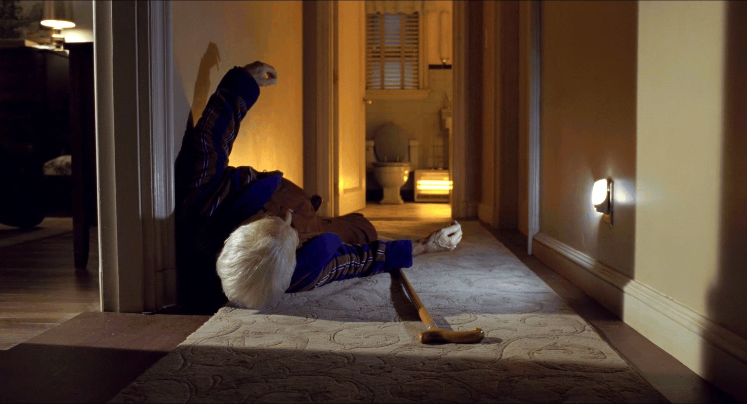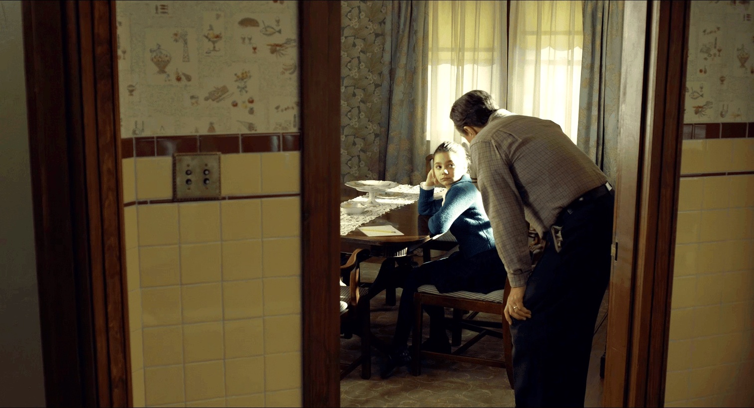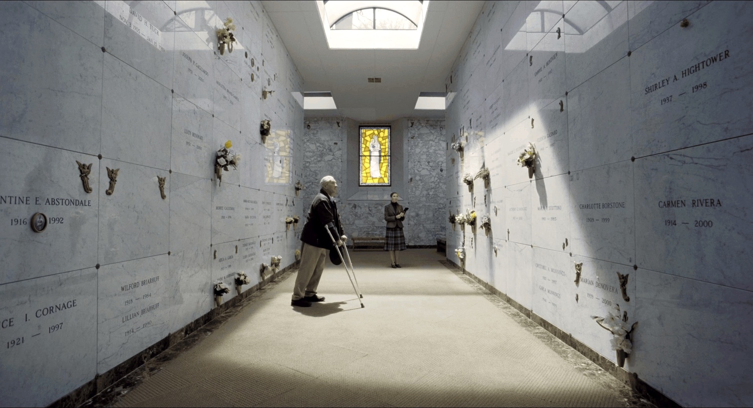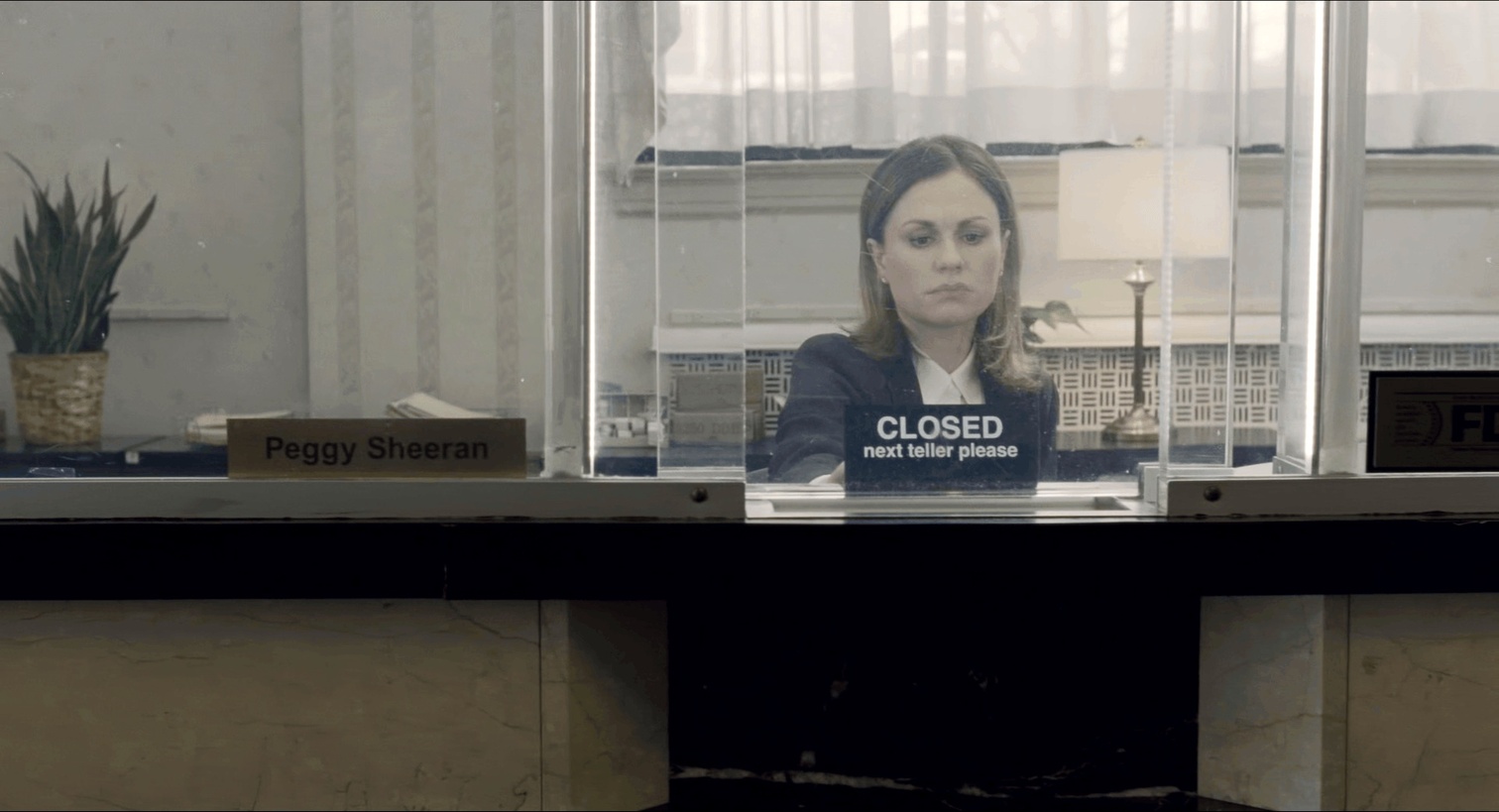 晚年的Frank自己吃不了药上不了厕所,一下摔在地上无法动弹。对比之下他颤颤巍巍的艰难走到柜台,甚至让后一个人先去柜台办理。观众们都在好奇这在干什么,镜头转到即将空出来的柜台,里面坐的正是Peggy,而她立刻关闭了窗口,Frank费尽周折却眼睁睁看着自己女儿从面前走开而无能为力。又是一段长长的无言镜头,结束于Frank转身离开颤颤巍巍的背影。