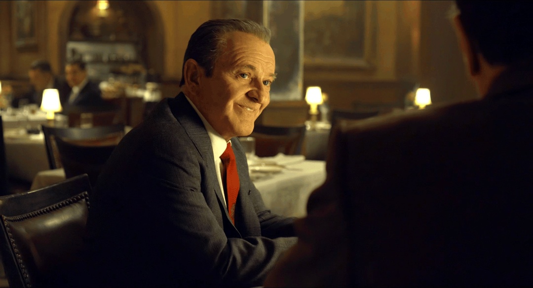 Russell是高手中的高手,主打的就是一个恩威并施,他有威胁的底气,还是因为在庆功宴上他告诉了Frank:“Only three people in the world wear one of which, only one of them is Irish”。呼应《The Irishman》的篇名,同时通过这样的手段给Frank绑上了“brothers”的锁链。所以回过头来看,可能有些观众会觉得Russell送Frank去Jimmy那儿是“进贡”,其实不然,他是安插了一枚眼线和定时炸弹。
