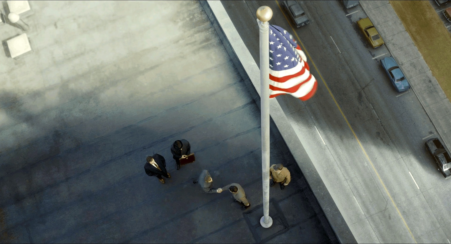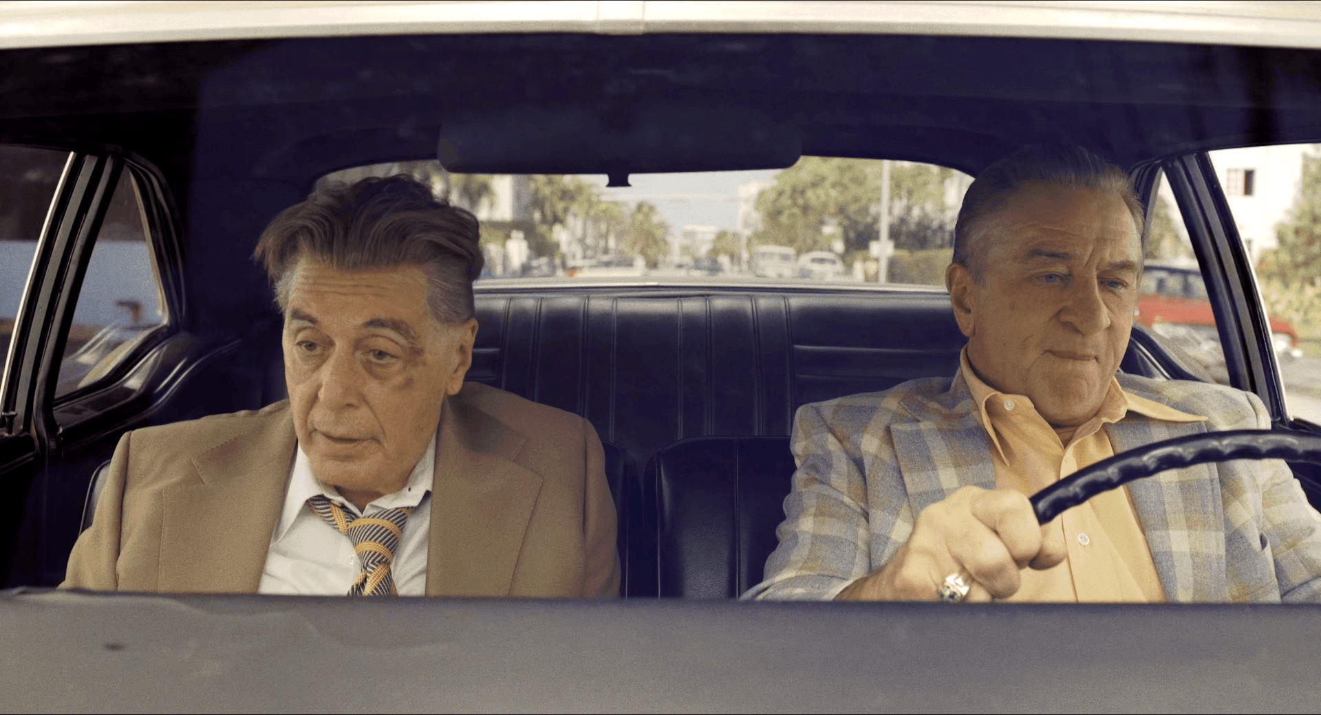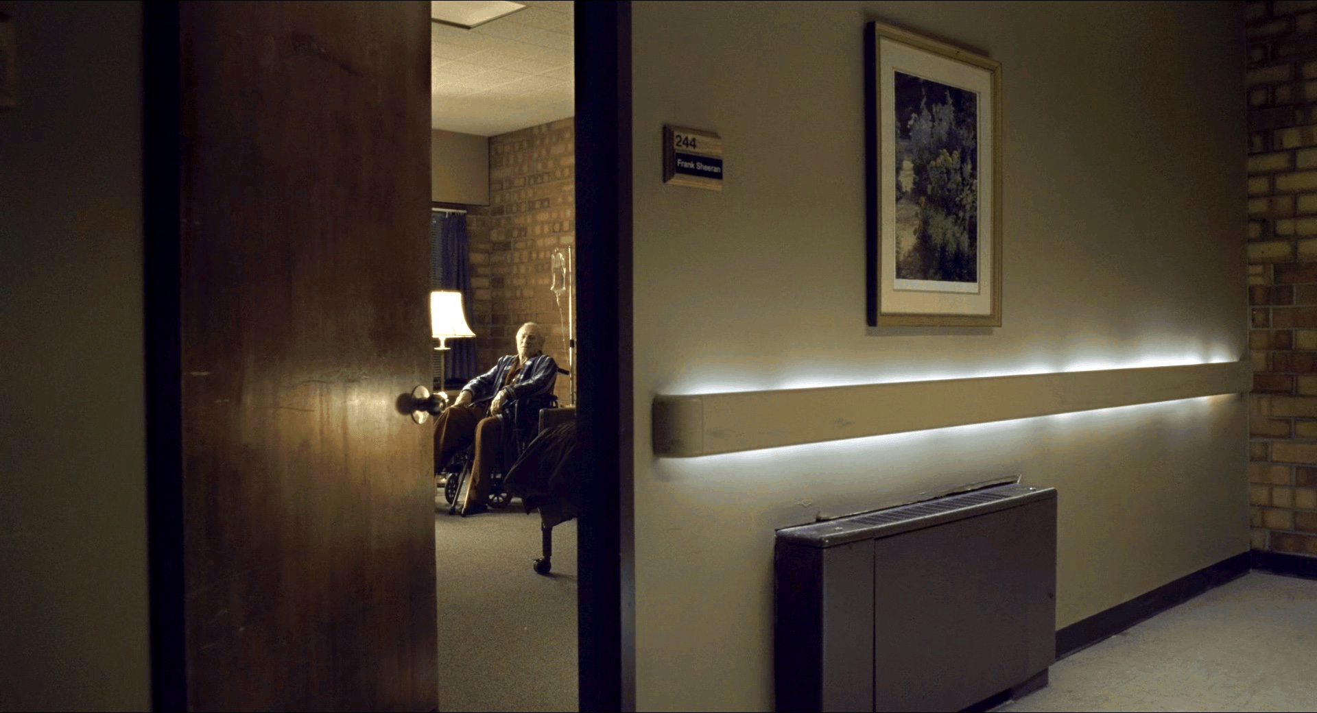 开篇就大秀操作,一个手持推拉长镜头,收音机里年代感十足的“In the Still of the Night”,一段“When I was young, I thought house painters paint the houses. Hah, what did I know”,画外音转画内音秀的天花乱坠。Jo Hoffa开车时音乐突然停止;Frank去杀Jimmy的时候音乐静默而肯尼迪遇刺的慢镜头配soft rock。整个拿捏。